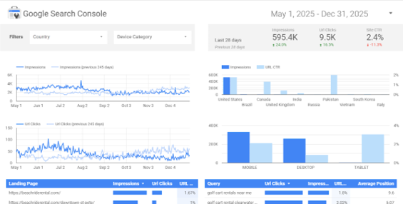 - Core money keyword “golf cart rentals near me” ranking on Page 1 with strong click volume High-intent local keywords like “golf cart rental Clearwater” averaging Top 5 positions